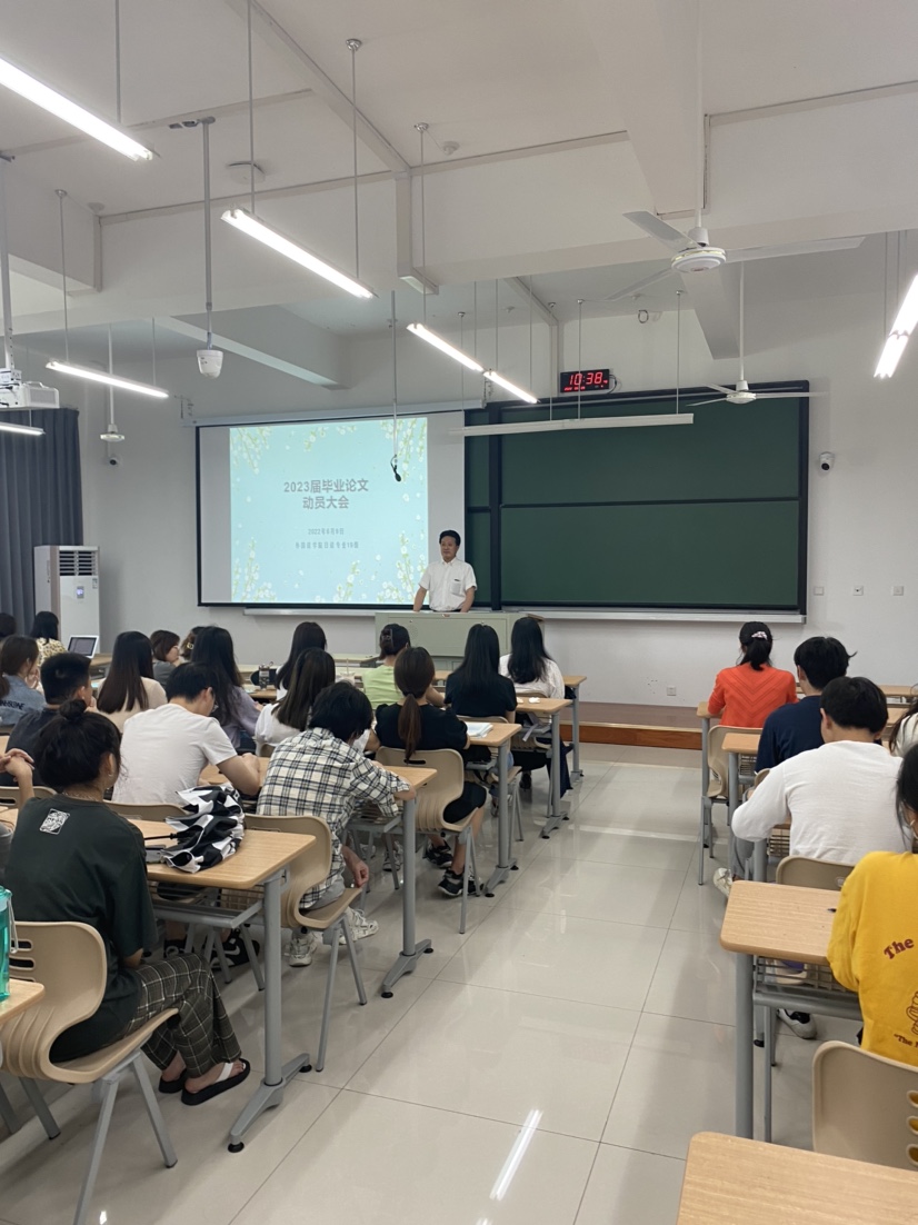 之后,专业负责人郭永恩就毕业论文做初始指导。他从学分设置、参与教师人数之多、课程设置要求之严格以及同学们人格塑造、价值凸显、衔接社会等诸多方面阐述了毕业论文这门大课的重要性,希望同学们能够利用暑假积极准备,以能在下学期的《日文论文写作》课上有精彩的表现。