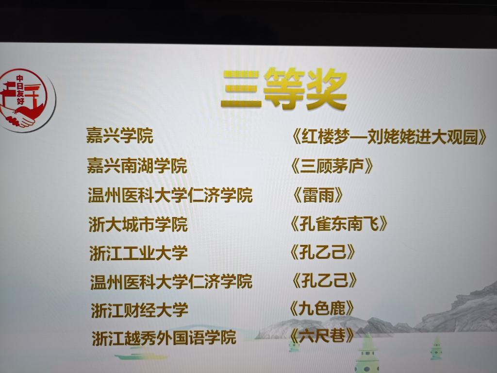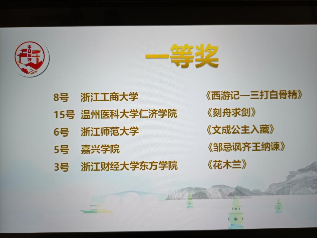 2022年11月26日,由浙江省人民对外友好协会主办,浙江工商大学东方语言与哲学学院团委承办,中国日语教学研究会浙皖赣分会、浙江工商大学和风日语协会协办的“第十一届浙江省日剧play大赛”顺利落幕。此次大赛的主题是“用日语演活中国经典”,吸引了浙江省高校31支队伍参赛,经过专家严格评审并参照日本国内点赞数,最终15支队伍进入决赛。在周艳君博士的悉心指导下,经过初赛、复赛和决赛的多轮激烈角逐,我院日语专业201和202两个班同学演绎的《邹忌讽齐王纳谏》和《红楼梦-刘姥姥一进荣国府》两个剧目分获一等奖和三等奖。