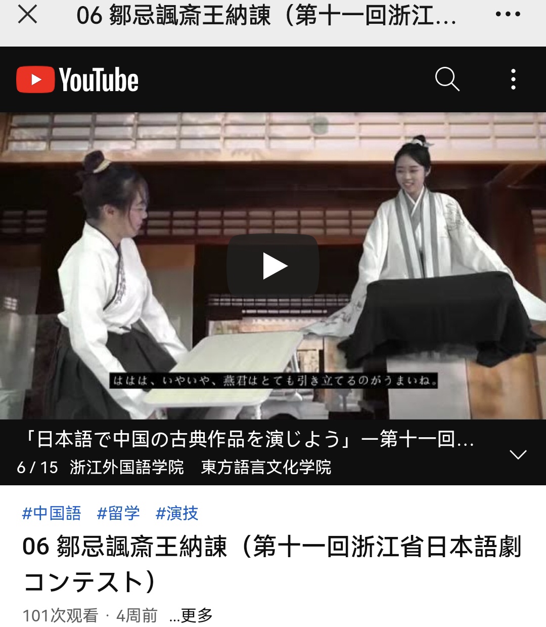 “浙江省日剧PLAY大赛”是浙江省高校开设日语专业比拼日语应用能力最具影响力的省级赛事,本届大赛首次设定主题为“用日语演活中国经典”,拷问对中国经典内涵的深刻理解,拷问日语演剧作品的原创水平,拷问同学们对细腻情感恰如其分的演绎。作品在前期被投放到日本国内的YouTube视频网站,通过日本人对于作品的点赞数反映中国经典故事的传播力度。惟其如此,此次大赛堪为最具挑战的一次比赛。我院日语专业的两部作品均属日语原创,学生们通过演剧,实实在在地弘扬了中国文化,真真切切地讲好了中国故事。