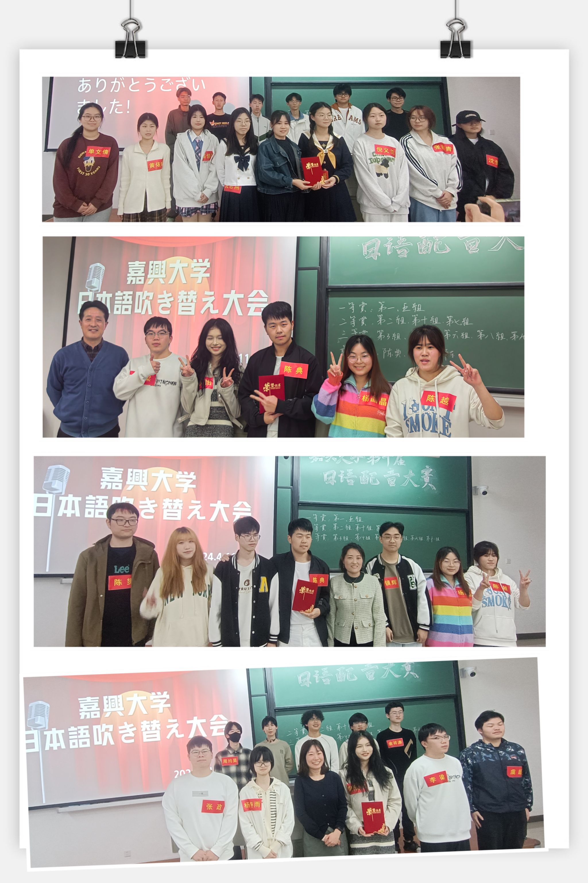 为了丰富大学生校园文化生活,锻炼同学们的日语应用能力,4月11日,日语系在兴德南楼203教室举办了“嘉兴大学第十届日语配音大赛”。来自日语专业和爱好日语的非日语专业同学11组共30余名同学报名参赛,郭永恩、张艳琴、金崎藍子、程建敏四位老师担任评委。