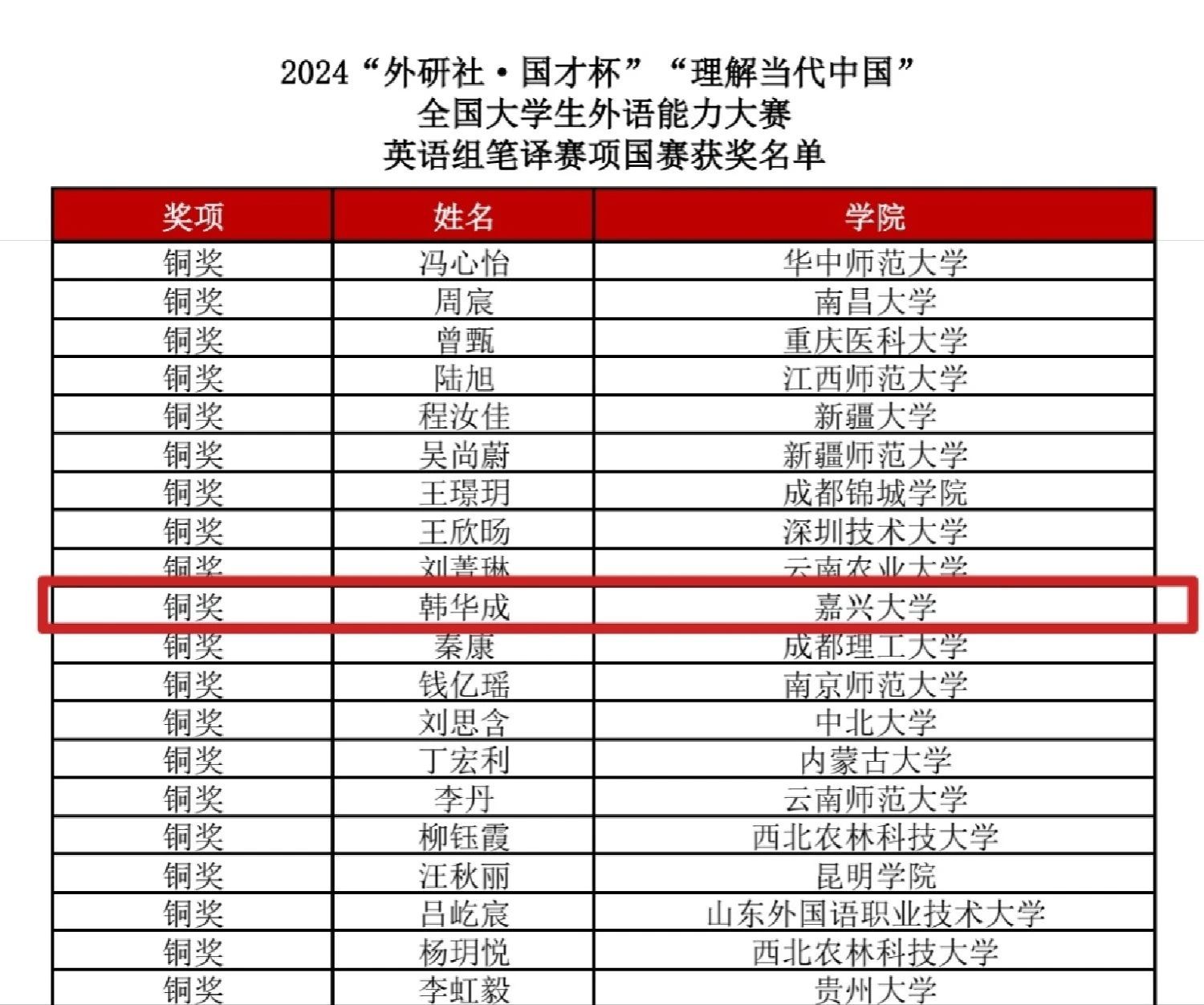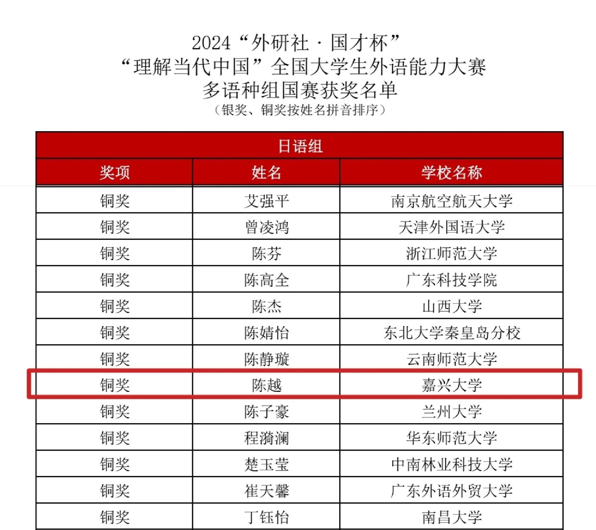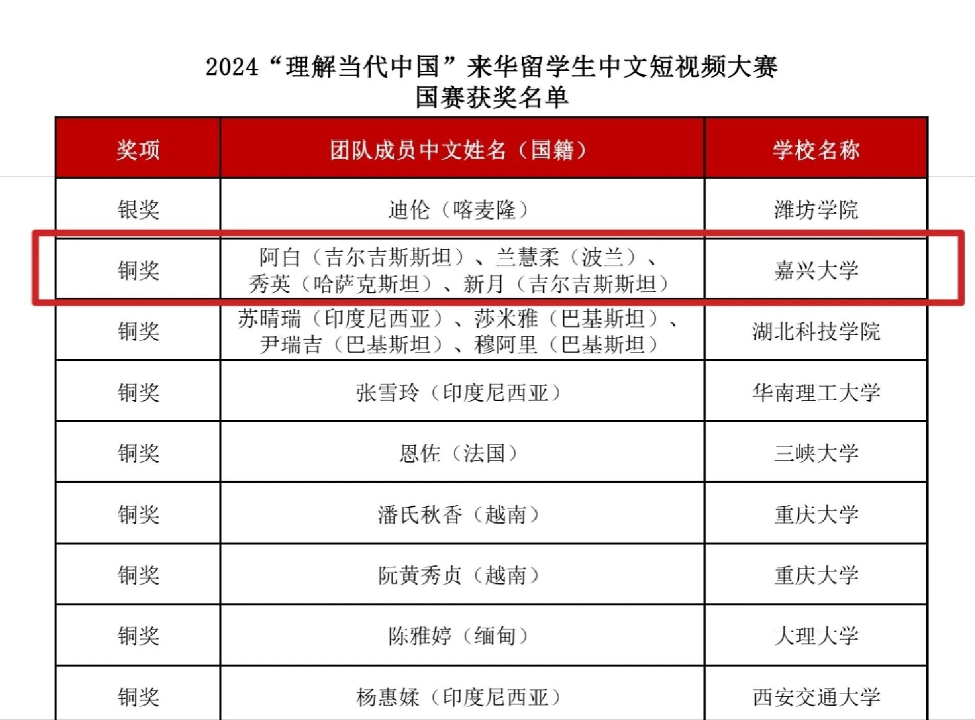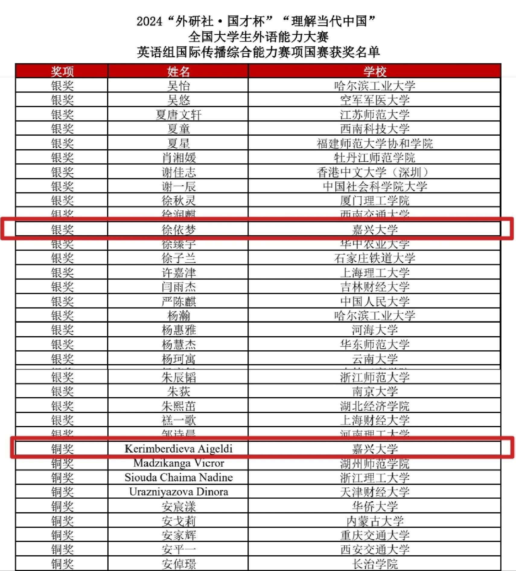 近日,2024年“外研社·国才杯”外语能力大赛落下帷幕,嘉兴大学进入全国决赛的8名选手参加了综合、笔译、短视频、多语种等多个赛道的激烈角逐。本次大赛我校选手获得银奖1项,铜奖4项。其中英语国际传播能力综合组英语22级徐依梦获银奖,国经22级Kerimberdieva Aigeldi获铜奖;笔译组英语22级韩华成获铜奖;短视频国际中文组国经22级DZHUMABEKOV ABAI(阿白),国经22级Wiktoria Litkowiec(兰慧柔),工商管理23级KUNTORE SUIKIMZHAN(秀英),国经22级Kerimberdieva Aigeldi(新月)获铜奖;多语种组日语22级陈越获铜奖。