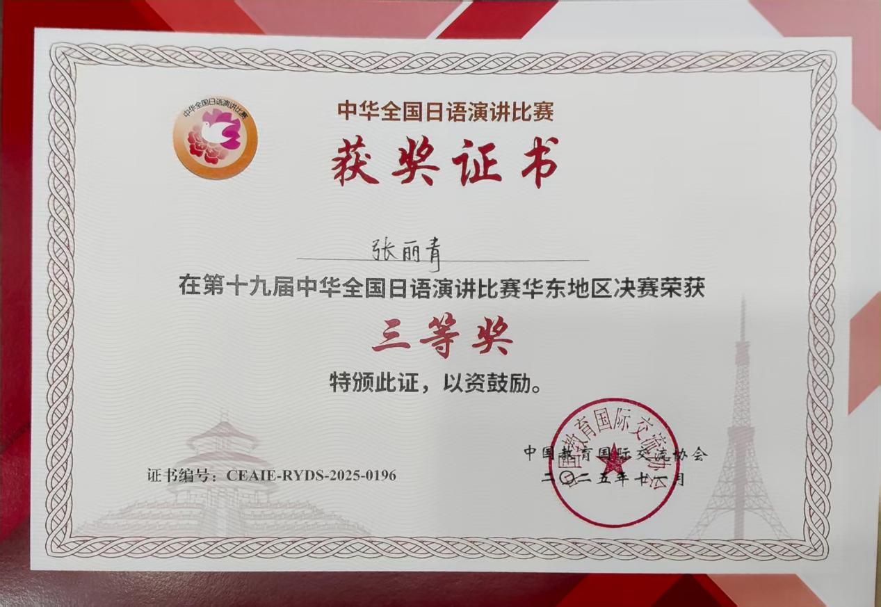 我校日语专业2023级张丽青同学沉着冷静、思维敏捷、表达流畅,凭借扎实的语言功底与出色的综合素养,荣获华东赛区三等奖,与来自浙江大学、复旦大学等高校的选手同台受奖,展现了我校学子的专业风采与精神面貌。