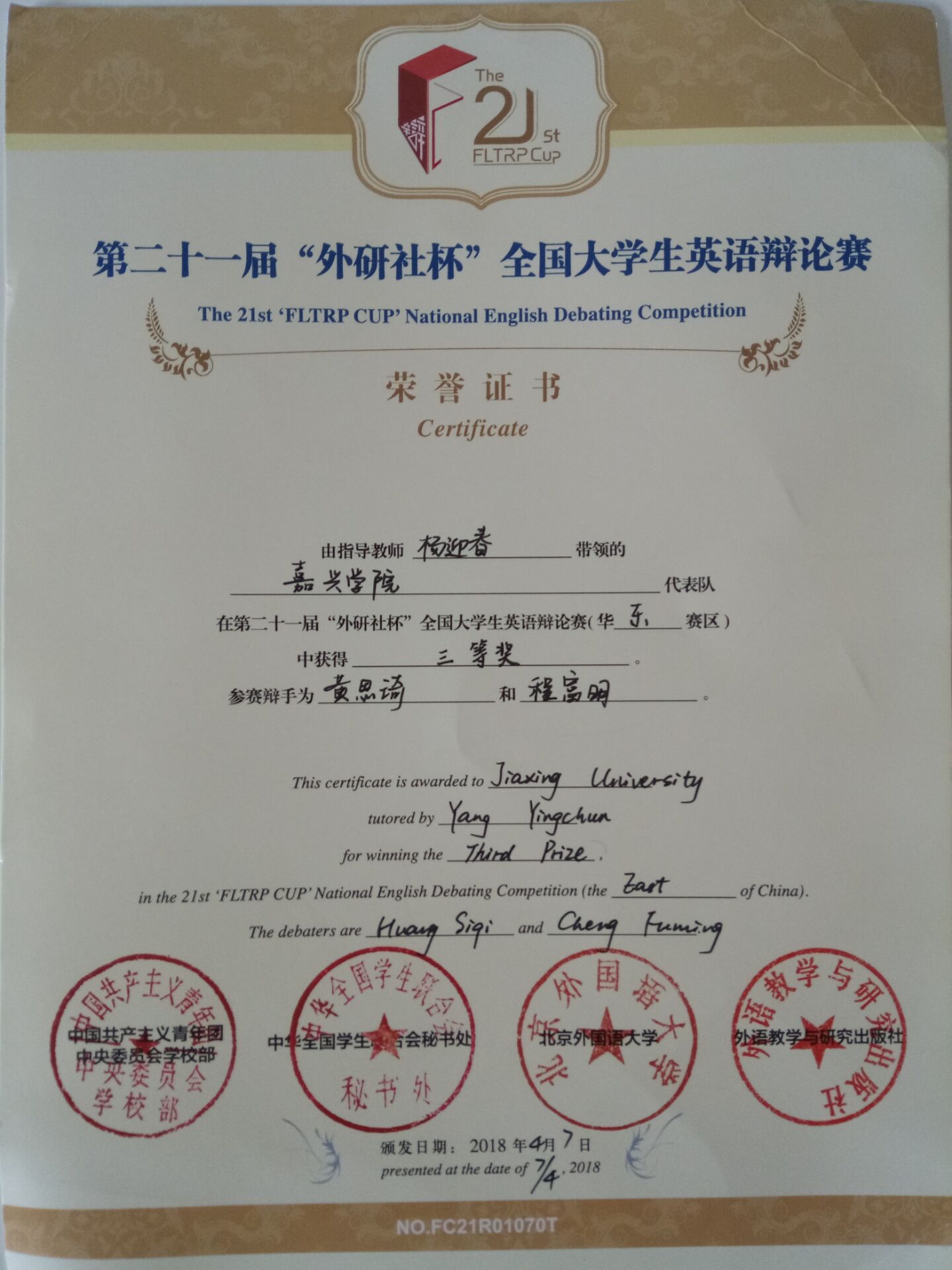 在由北京外国语大学、外语教学与研究出版社、中华全国学生委员会秘书处等单位联合主办的第二十一届“外研社杯”全国大学生英语辩论赛(华东赛区)中,我院英语专业学生黄思琦和来自医学院的程富明同学的组队,获得了三等奖1项。
