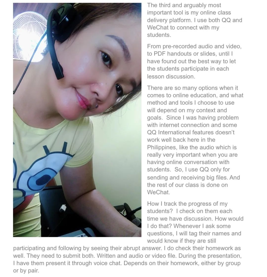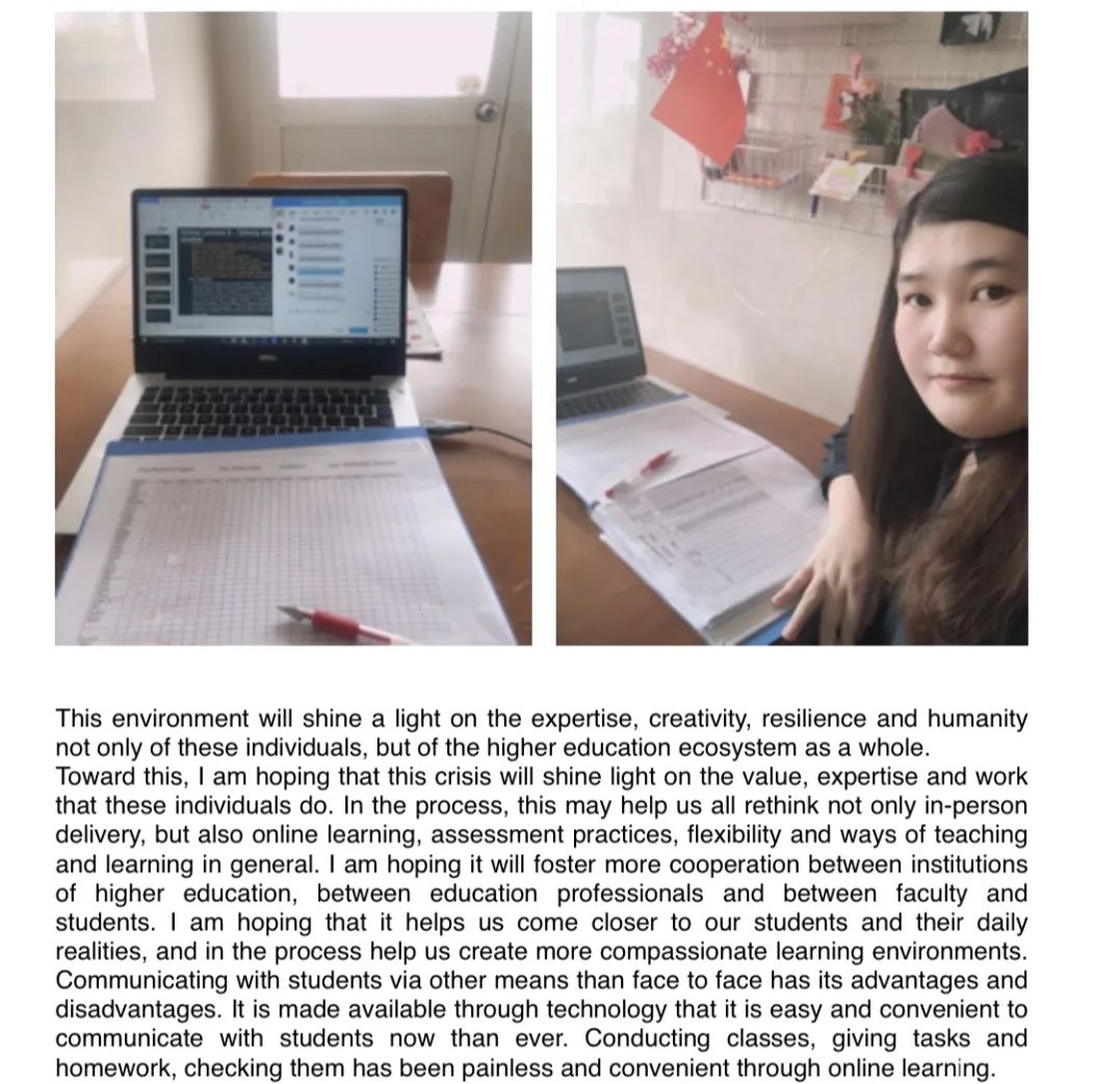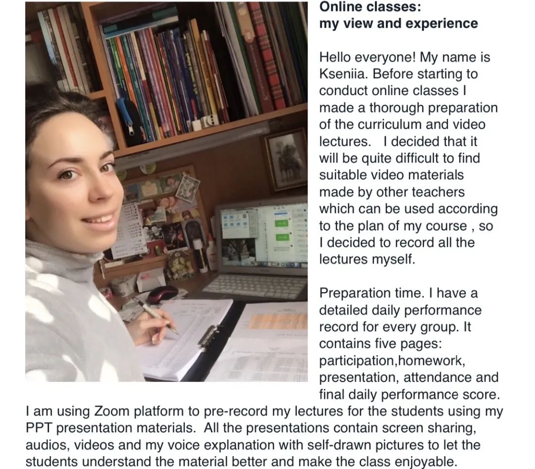 疫情之初,有四位外教在国内,三位外教已返回故乡度假。开学前两周,外教们收到在线教学的通知,除美国外教Daniel因时差关系无法开展在线授课外,其他外教都积极响应。身在乌克兰的外教Kseniia听到这个消息非常兴奋,她非常渴望以另外一种方式与学生见面。Kseniia努力克服8小时的时差,在教务办老师的协调下,重新调整了部分班级的上课时间,她所担任的13个口语教学班的课程一个也没有少,全部如期顺利开展。远在菲律宾的外教Len将手提电脑和教学文件等都留在了中国,为了不影响在线教学质量,她在本国又重新购置了电脑并安装了所需的软件以开展教学。她们说距离不会阻断她们对学生的爱。