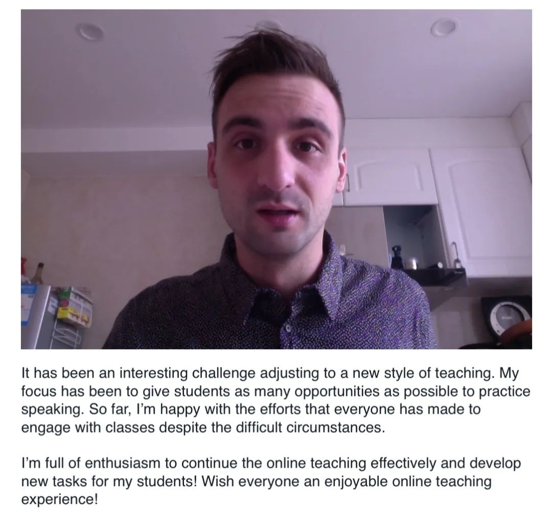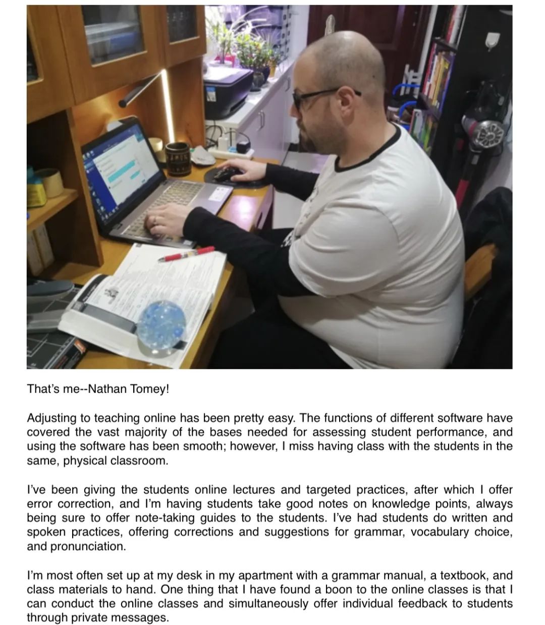 我们坚信疫情终将散去,线下教学秩序也将很快恢复。相信在线教学的经历会给传统课堂注入新的活力,在线平台及教学软件的熟练应用也会使线下的口语课堂更加精彩。正如外教们所说,他们不会忘记这段特殊时期大家齐心协力共克时艰的经历,也会倍加珍惜即将到来的与学生面对面互动教学的宝贵时光。