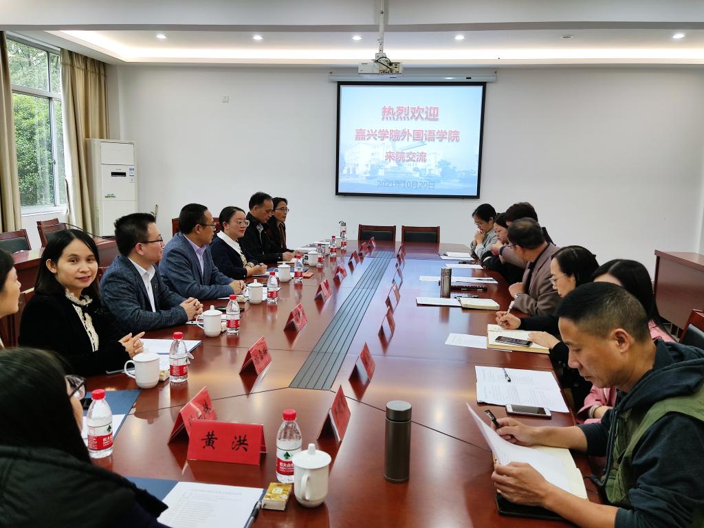 调研得到台州学院网上赌场 热情又隆重的欢迎和接待,台州学院网上赌场 长刘宏照、副院长刘富丽,副院长卢立伟及相关系部和部门主任均出席本次调研活动。首先,在台州学院网上赌场 领导带领下,老师们参观了台州学院网上赌场 教学实践平台、系部办公室、图书室、报告厅、健身房和外语学院文化墙,参观的老师们对跨境电商直播室留下了特别深刻的印象。参观结束后,刘宏照院长和刘富丽副院长先后介绍了台州学院网上赌场 的概况、师资、人才培养、专业建设、课程建设和工作中取得的成就及面临的困难,喻锋平副院长就嘉兴学院网上赌场 以上各个方面的情况和办学特色做了详细的介绍,会上双方进行充分的沟通和交流。此后,两个学院的英语专业、大外部、学工办和教务办相关部门的负责人和老师又进行一对一分组交流,详细、深入和高效地探讨各自关注的内容和问题。