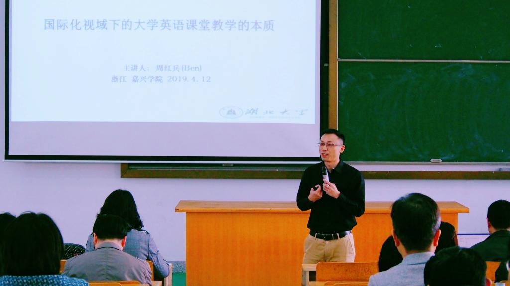 2019年4月12日下午,应网上赌场 邀请,“湖北大学学子心中最有魅力教师”周红兵副教授在外语楼310做了一场题为《国际化视阈下的大学英语课堂教学本质》的学术讲座。讲座由大外部高万全主任主持,全体大外教师和部分南湖学院大外教师到场细心聆听。