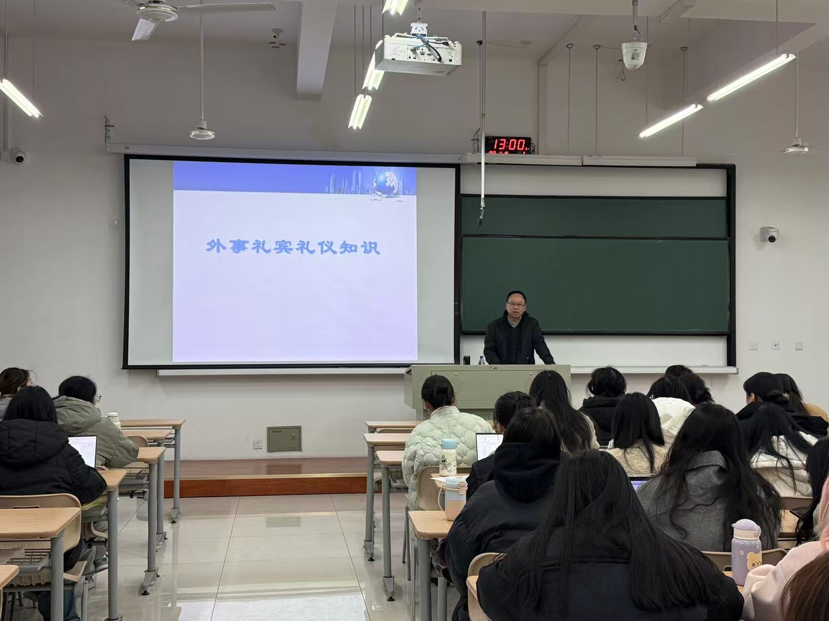 2025年11月28日,浙江省人民政府外事办公室经济与新闻处张汶处长应邀莅临网上赌场-网上赌场app下载 ,为高年级本科生、翻译专业硕士研究生及教师代表五十余人,作题为“外事礼宾礼仪知识”的专题讲座。
