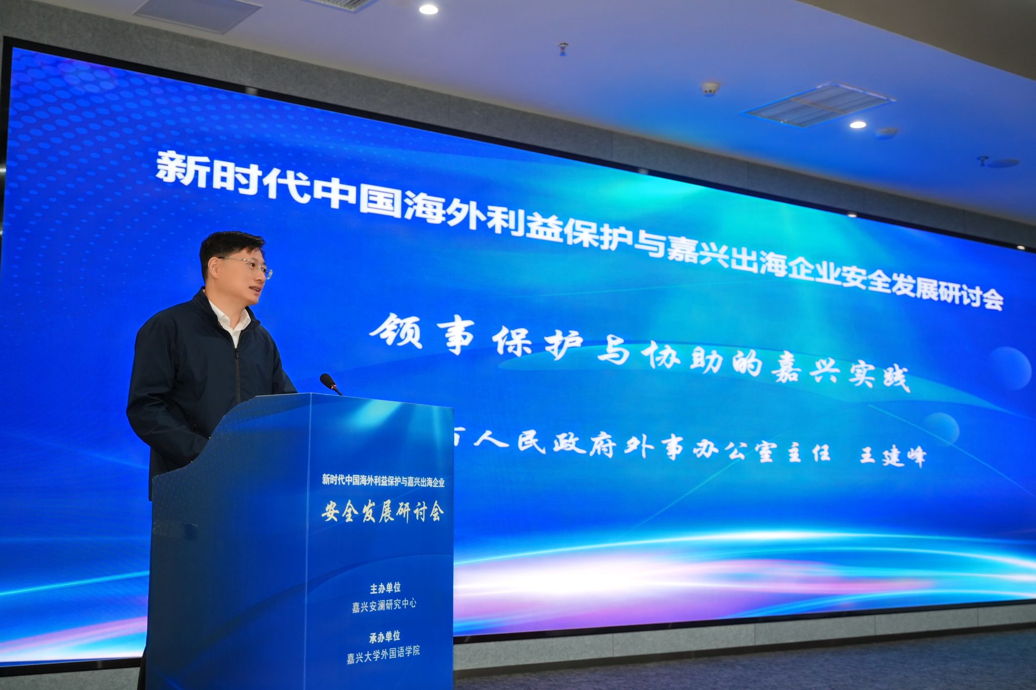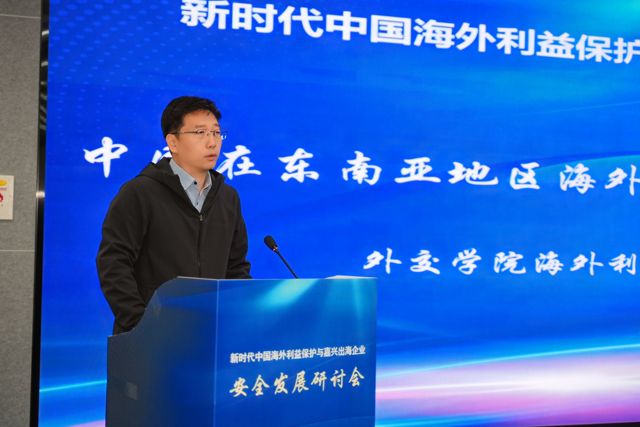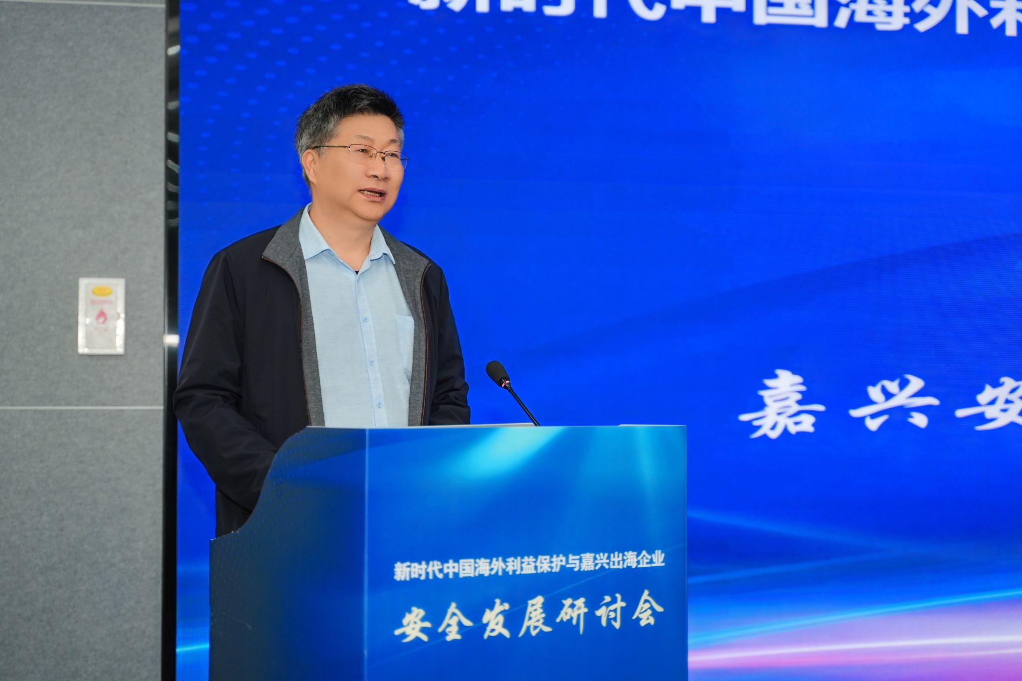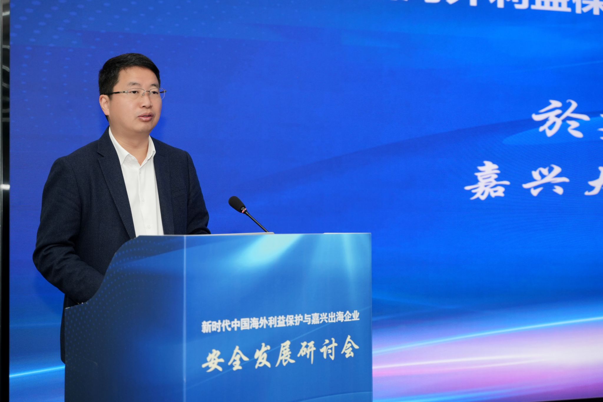 於建明在致辞中指出,海外利益保护事关发展安全,企业安全发展事关嘉兴未来。当前国际局势复杂多变,企业“出海”安全挑战日益增多,海外利益保护已成为必须答好的“必修课”。他希望与会嘉宾以本次研讨会为契机,围绕“海外利益保护”聚智聚力,为嘉兴企业出海行稳致远保驾护航,为国家海外利益保护战略落地落实贡献力量。於建明表示,嘉兴大学将持续大力推动区域国别学交叉学科建设,依托多学科优势建强嘉兴安澜研究中心智库平台,聚焦政策咨询与投资风险预警,打造“智库+教育”双平台,构建“咨政——人才——传播”三位一体战略支撑体系,以学术成果搭建国际对话桥梁、提升中国全球治理话语权,高质量服务区域高水平对外开放,为嘉兴打造长三角全面开放新高地贡献力量。