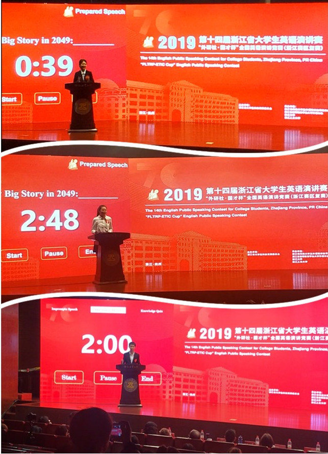 2019年10月26,27日“外研社·国才杯”全国英语演讲竞赛(浙江赛区复赛)在浙江杭州浙江工业大学屏峰校区举行。来自浙江省54所高校的160名选手参加了此次比赛。经过两天激烈的角逐,我校选送的选手何鑫,杨惠敏和章馨尹取得了省赛二等奖一项,三等奖两项的好成绩。