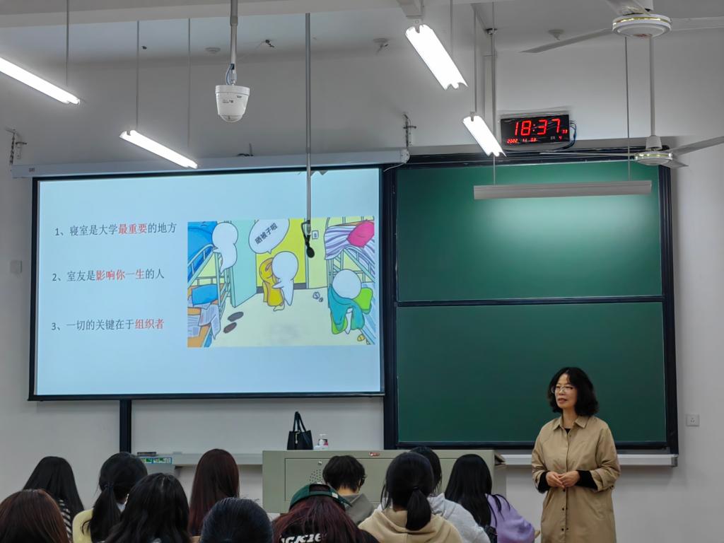 首先,姚老师提出“为什么要当寝室长”这一问题,并邀请了几位寝室长讲述理由,其中有“自愿为大家服务”“投票选举出来”“第一个到寝室所以成为了寝室长”等理由。对此,姚老师指出寝室长在一个班级和一个寝室中扮演的重要角色,寝室是同学们的家,而室友就是家人,大家要互相关心、互相扶持。