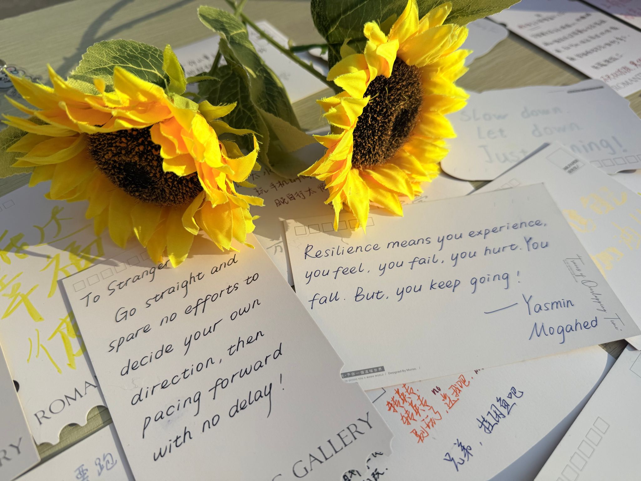 活动现场布置简洁温馨,长桌上摆放着向日葵与多种彩色卡纸。参与者可自取明信片,写下自己的心情或祝福语投入信箱,并随机抽取他人留言。在短短半小时内,信箱中已积累数十张真挚留言,“今天风很温柔”“别怕,明天会亮”等句子成为现场高频互动内容。网上赌场 学生会志愿者还在现场提供热茶与主题书签,进一步营造出温暖而宁静的交流氛围。