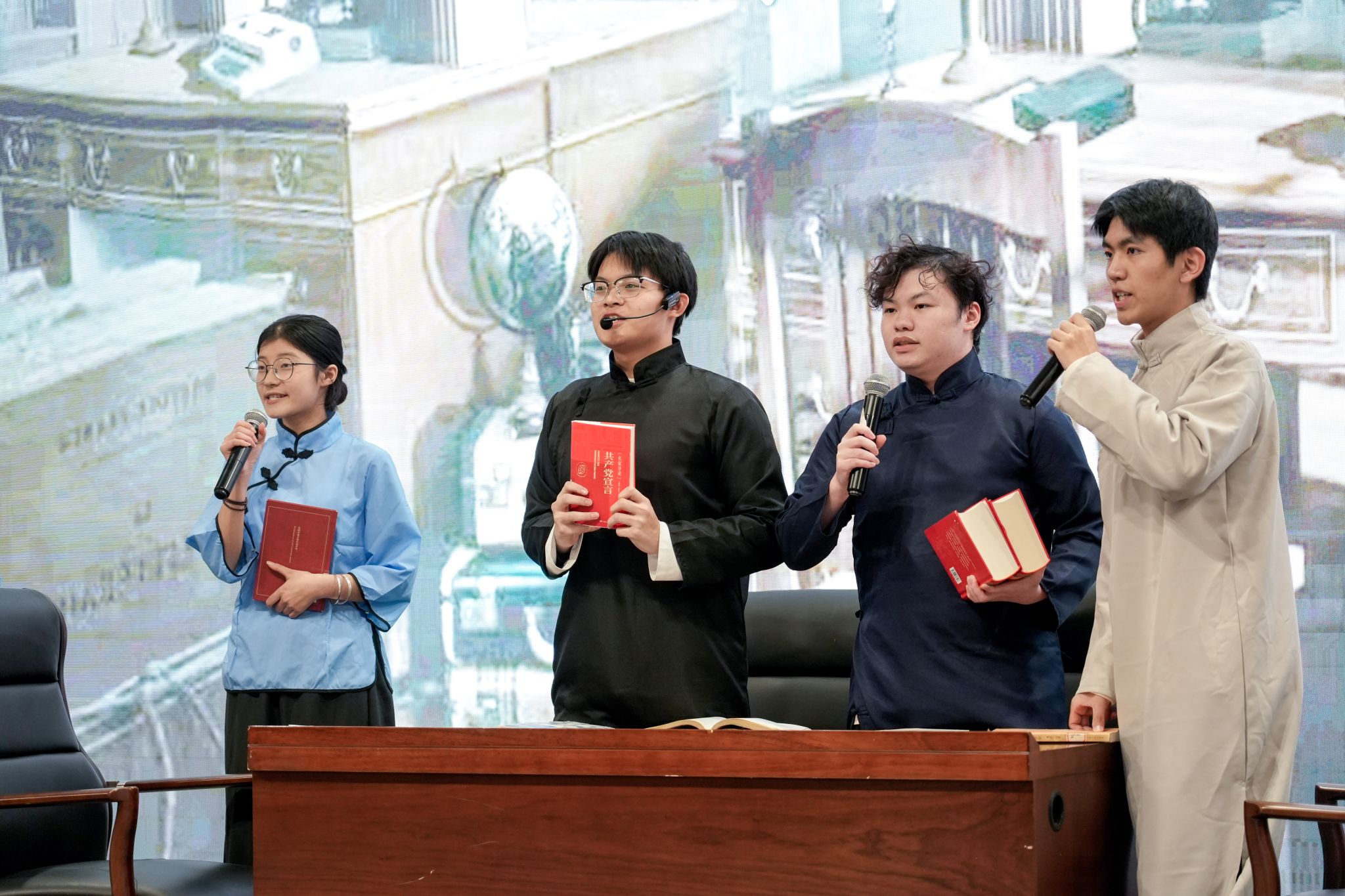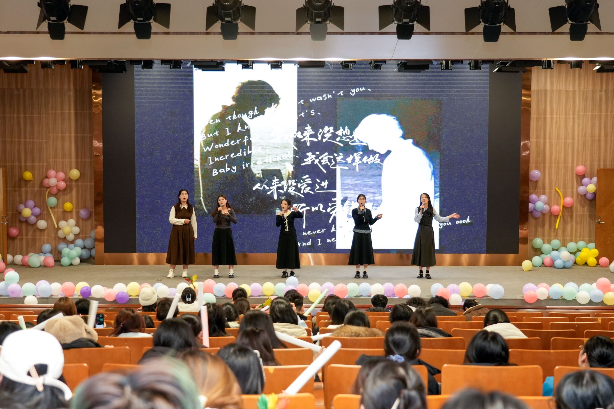 诗意环节《万语诗心》通过深情的多语种诗歌朗诵,引领观众领略语言之美;小提琴独奏《Por una Cabeza》旋律悠扬,彰显艺术修养。其间亦不乏青春洋溢的歌曲演绎,《Wonderful U》、《爱错》等曲目引发全场共鸣,而辅导员陈泳杰老师自弹自唱的《Fly Me to the Moon》更是将浪漫氛围推向高潮。特别环节中,学生党员代表通过情景表演《真理的味道有点甜》,生动诠释了信仰的力量;创意演剧版《爱情公寓》则以英语全新演绎,为熟悉的故事注入别样韵味。活动在歌曲串烧《Planet》《红尘客栈》《I Love You So》的温暖旋律中精彩收官。