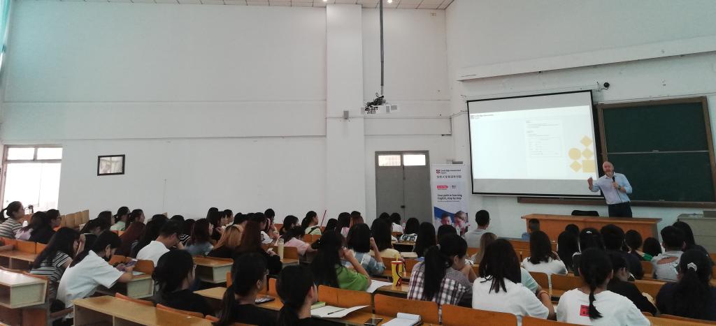 随后,在英语语言教学和测评领域有着长达25年经验的Ian Cawley先生为嘉兴学院学生做了题为“Business qualifications: how and why for students”的讲座。他首先说明了商务英语资格证书的特点与用途,再从口语、写作、词汇、听力等方面专业解读了如何才能高效地进行商务英语学习和备考以及提升语言应用能力。他在现场为考生们答疑解惑,与学生们轻松互动,气氛热烈。与会学生在聆听了Ian深入浅出的讲解后,纷纷表示对BEC考试特点与考核重点有了深入的了解,对接下来如何备考也有了明确的方向和行之有效的策略。最后,大家对Ian教授的精彩讲座报以热烈的掌声,依依不舍地送别了Ian和剑桥大学英语考评部一行。
