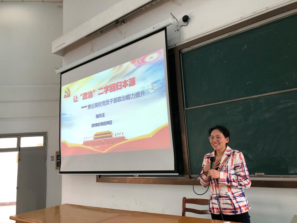 讲课开始之前,陶丹玉表达了对网上赌场 和数理与信息工程学院全体班子成员和中心组理论学习成员的衷心感谢,她从两个学院多次的集中学习和交流讨论中得到诸多启发,受益匪浅。接着,她从政治能力的概念和内涵、新时代为什么要强调政治能力、如何提高政治能力等几个方面展开论述。