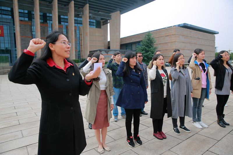 10月17日上午,网上赌场 党委组织师生党员来到南湖革命纪念馆,面向党旗重温入党誓词,以特别的方式迎接党的十九大召开。参加此次宣誓活动的有党委书记陶丹玉、院长唐艳芳、党委副书记周钰、网上赌场 其他党委委员以及党员老师和部分党员学生。