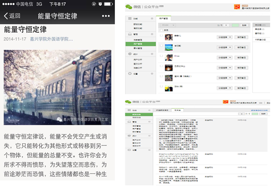 “红船微信课堂”自2014年底建立以来,以其“短、快、新”的特色,坚持做到“每日一课”,改变传统阅读模式,使党员学习实现“正能量随身带、新知识随时学”,本学期开设“党校课堂我参与”活动,改变以往信息单纯由一人发放的模式,参与者可将图文信息发送到审核人手中,集中筛选优质信息逐日发送,图文信息将显示信息报送员姓名,此方法受到学生党员和部分入党积极分子的积极关注,也吸引了部分非党员教师、同学关注。“手机党校”打破了党员学习固定的空间限制,通过一种以自然的、潜移默化的方式传递思想、反映动态、展示先进、成为助推党的群众路线教育实践活动深入开展的有力推手。