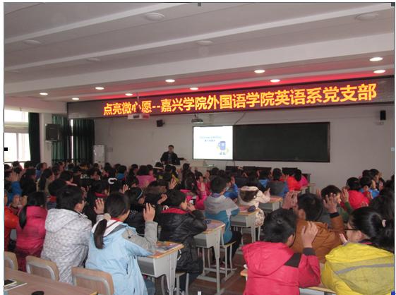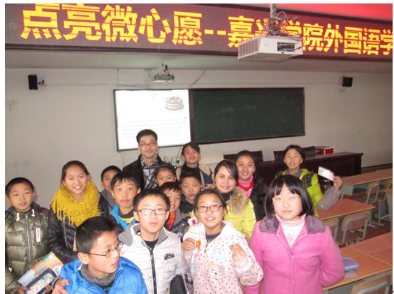 2014年12月19日下午,英语系党支部成员鲁俊丰、杨雪梅同志代表支部来到平湖市如意社区,为该社区所辖的平湖市实验小学六年级的同学上了一堂生动有趣的英语课。