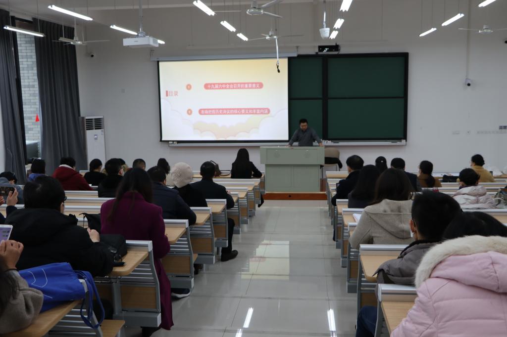 为深入学习贯彻党的十九届六中全会精神,全面准确把握全会精神的核心要义和主旨精髓,12月16日下午,网上赌场 邀请校人文社科处处长彭冰冰教授作党的十九届六中全会理论宣讲报告会,主题为“历史经验与马克思主义中国化——学习领会党的十九届六中全会精神” 报告会由学院党委书记周钰主持,网上赌场党政 领导班子成员、全体教职工参加。