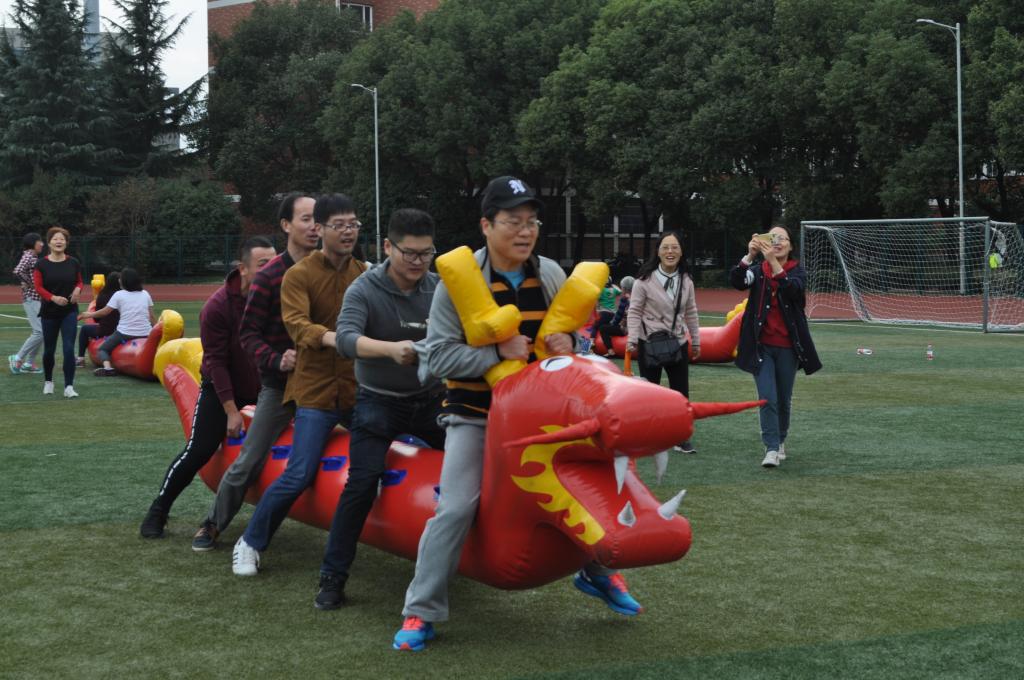 紧接着的“长风破浪”项目差点难住了10位老师!一条环状的软梯要用手脚转动起来,让大家真有点不知所措?巴普洛夫说“观察,观察,再观察。”在观察了其他院系代表队的比赛后,我们决定让刁俊春老师和周振行老师作为前后脊梁,带领8位女老师从容上阵,并取得了第六的较好成绩。充满了童趣的趣味比赛伴随着夕阳结束了,老师们依然意犹未尽,还在操场上为刚才没能充分发挥自己的最好水平而热烈讨论着。