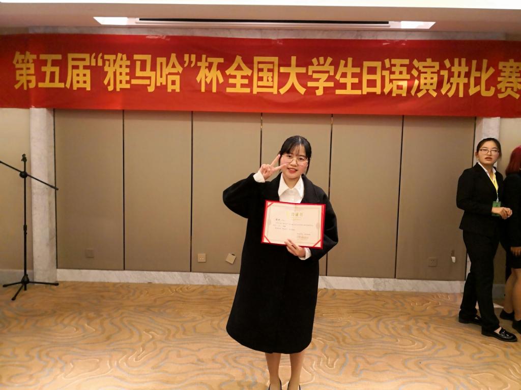 4月14日,我院日语专业2016级徐欢同学参加了由全国11省共42所高校日语专业学生激烈角逐的第五届“雅马哈”杯全国大学生日语演讲大赛,她一路拼搏,过关斩将,挺进决赛,并最终收获三等奖,与上海财经大学、浙江理工大学、东华大学和洛阳网上赌场 等日语专业的同学并列站在了领奖台上。