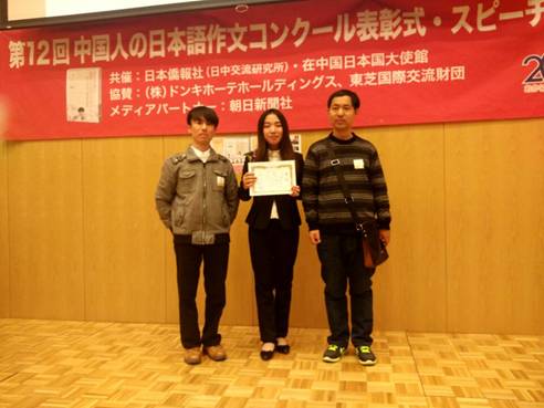 2016年 12月12日,由日本侨报社•中日交流研究所主办的“第12届中国人日语作文大赛颁奖仪式”在北京日本驻中国大使馆举行。我校网上赌场 日语专业李琳玲和朱杭珈两位同学分获三等奖,张媛媛和严晨曦两位同学分获佳作奖,日语系畅宝仁和小林新两位老师获“优秀指导教师奖”,嘉兴学院网上赌场 日语系被授予了“园丁奖”。