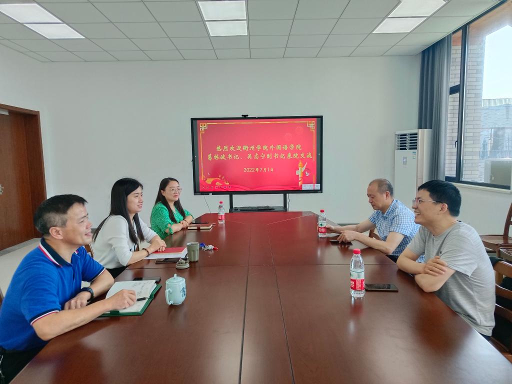 7月1日下午,衢州学院网上赌场 党委书记葛林波、党委副书记吴志宁来学院考察交流。学院党委书记周钰、院长唐艳芳、党委副书记朱莹出席交流会。