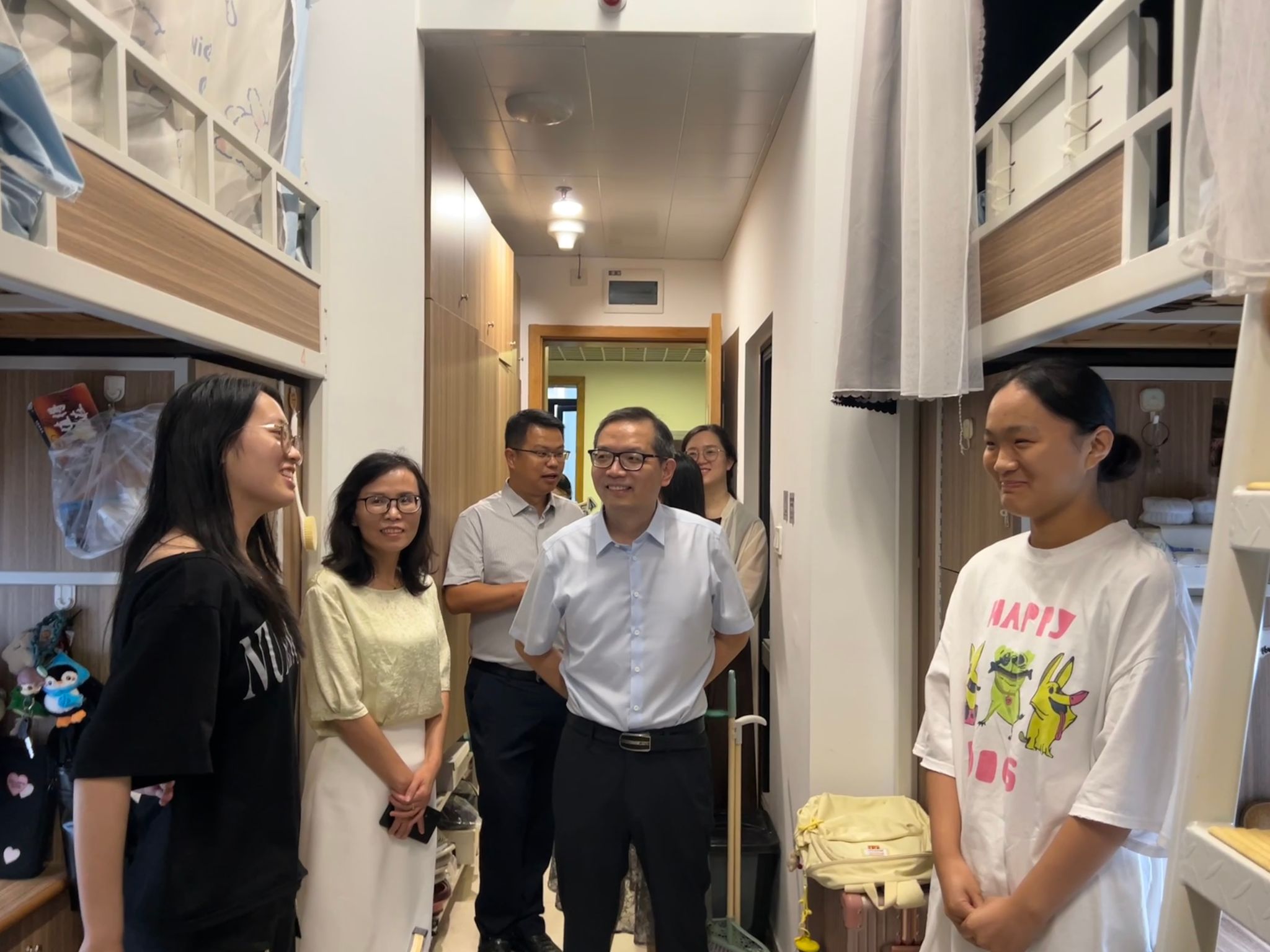走访过程中,周宏伟与同学们亲切交流,热情询问假期生活、入学感受、学习进展及科研规划等方面的情况。在研究生新生寝室,周宏伟对首届翻译硕士研究生的到来表示热烈欢迎,他鼓励同学们珍惜宝贵的学术时光,研一就要做好学术规划,打好专业基础,提升实践能力,勇于面对挑战,脚踏实地、不断进取,在科研道路上勇攀高峰,努力成长为具有家国情怀和国际视野的高层次、应用型翻译人才,为讲好中国故事、促进文明交流互鉴贡献力量。