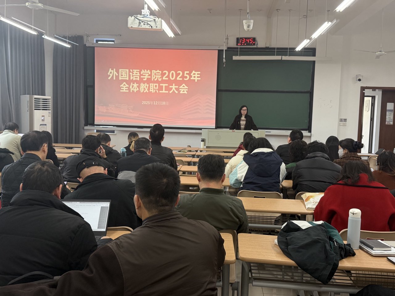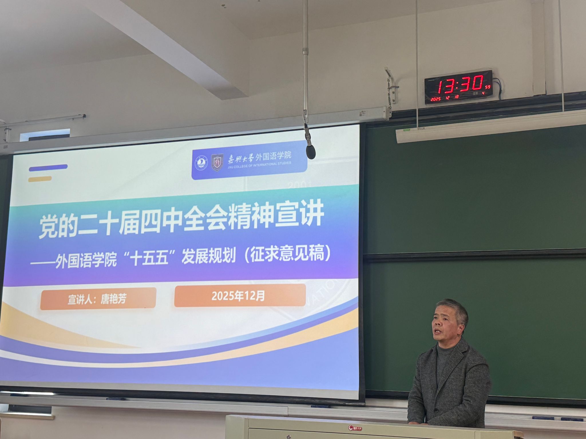 院长唐艳芳就学习贯彻党的二十届四中全会精神和省委十五届八次全会精神,科学系统做好学院“十五五”发展规划做专题宣讲。他系统回顾了“十四五”期间学院在党建工作、师资队伍、学科科研、教学及教育国际化、学生管理工作等方面取得的重要成绩,分析了当前学院发展面临的问题和挑战,提出了未来五年学院发展的重点任务与举措:一是推动党建工作提质增效,以高质量党建引领学院高质量发展;二是优化学科布局,继续巩固外国语言文学学科优势,重点发展区域国别学交叉学科;三是优化人才工作机制,推进人才队伍整体结构持续优化,更好地服务于学院未来发展及学科交叉融合等战略转型需要;四是以新文科建设为契机,推动专业内涵式发展,培养适应新时代需求的外语人才;五是拓宽教育国际化渠道,继续深化与高水平大学合作;六是加强学生工作体系建设,打造具有外语特色的学工品牌。